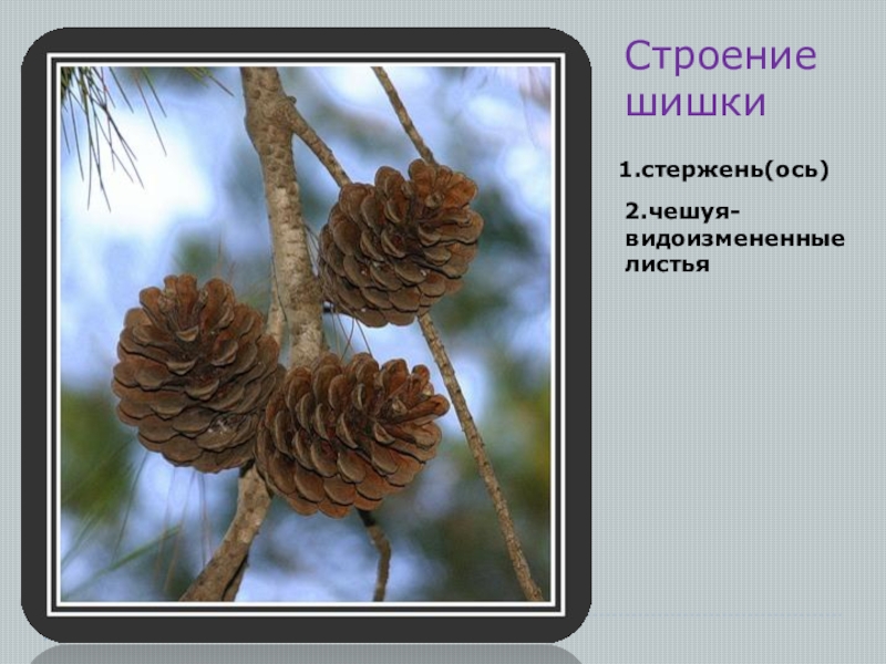 Строение шишки1.стержень(ось)2.чешуя-видоизмененные листья
