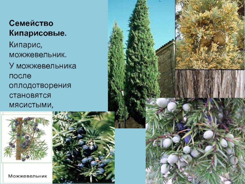 Семейство Кипарисовые.Кипарис, можжевельник.У можжевельника после оплодотворения становятся мясистыми, срастаются и образуют «шишко-ягоду».
