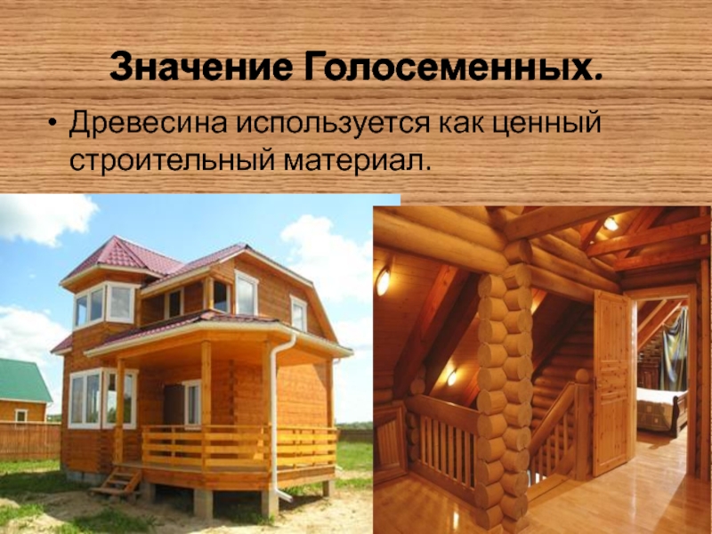 Значение Голосеменных.Древесина используется как ценный строительный материал.Значение Голосеменных.