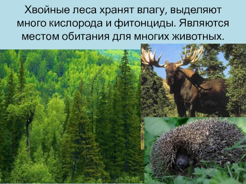 Хвойные леса хранят влагу, выделяют много кислорода и фитонциды. Являются местом обитания для многих животных.