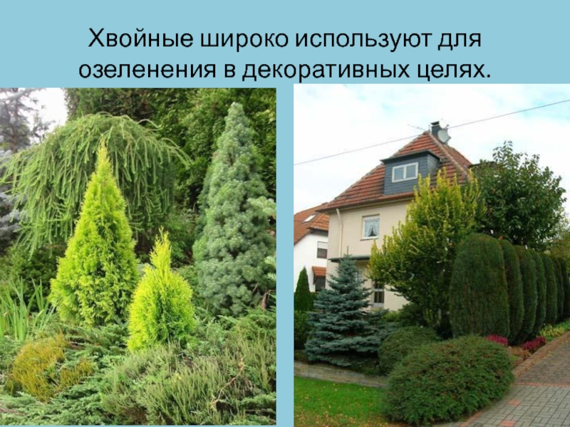 Слайд 18Хвойные широко используют для озеленения в декоративных целях.