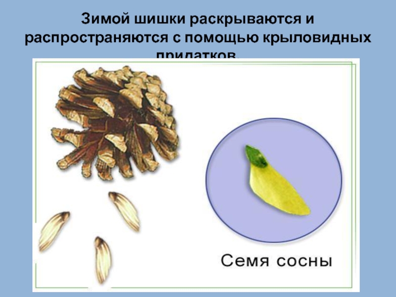 Слайд 9Зимой шишки раскрываются и распространяются с помощью крыловидных придатков.