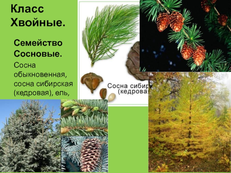 Класс Хвойные.Семейство Сосновые.Сосна обыкновенная, сосна сибирская (кедровая), ель, пихта, лиственница.