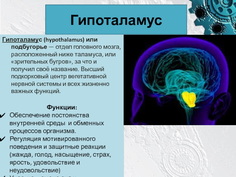 Гипоталамус (hypothalamus) или подбугорье — отдел головного мозга, расположенный ниже таламуса,