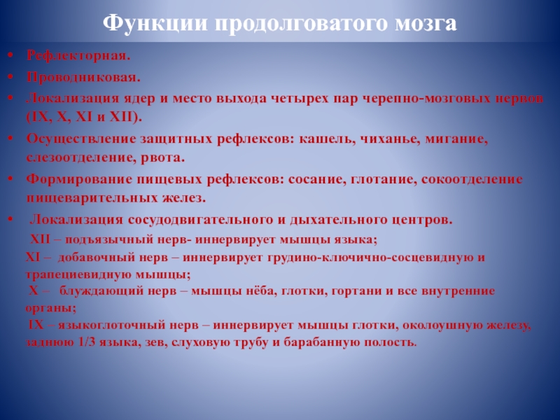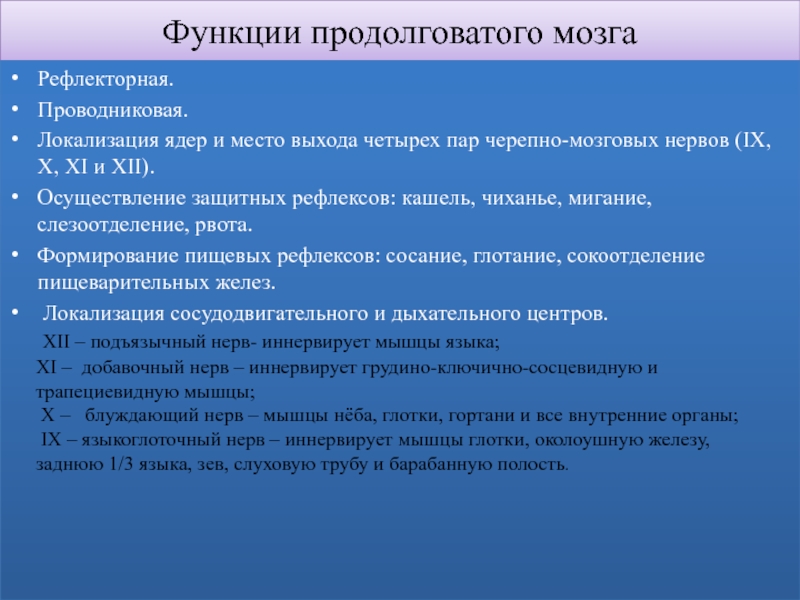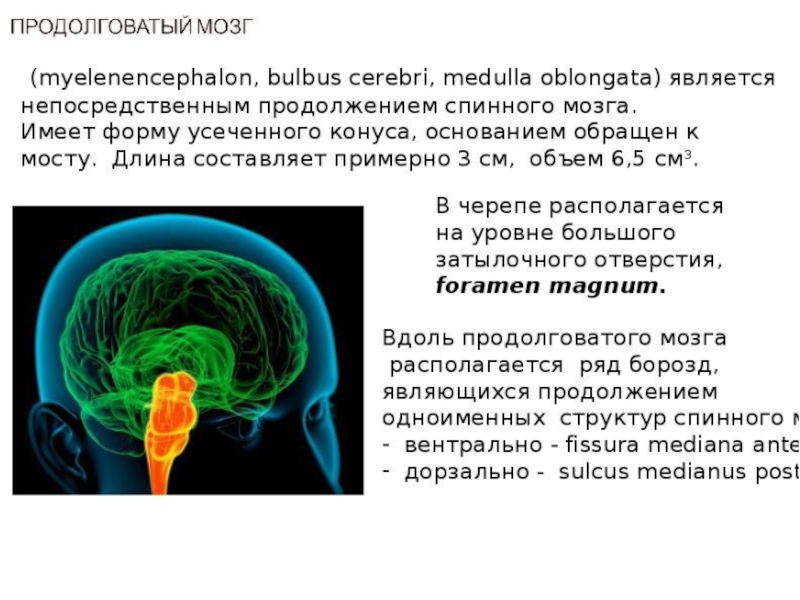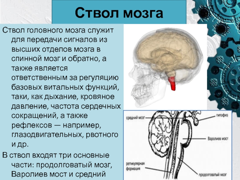 мозга в спинной мозг и обратно, а также является ответственным за регуляцию базовых витальных функций, таки, как дыхание, кровяное давление, частота сердечных сокращений, а также рефлексов — например, глазодвигательных, рвотного и др.