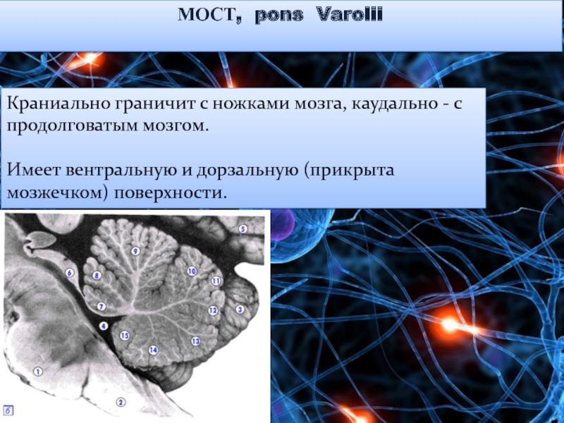 Краниально граничит с ножками мозга, каудально - с продолговатым