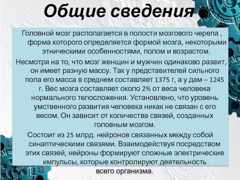 Слайд 2Головной мозг –главный отдел центральной нервной системы. Он является регулятором всех