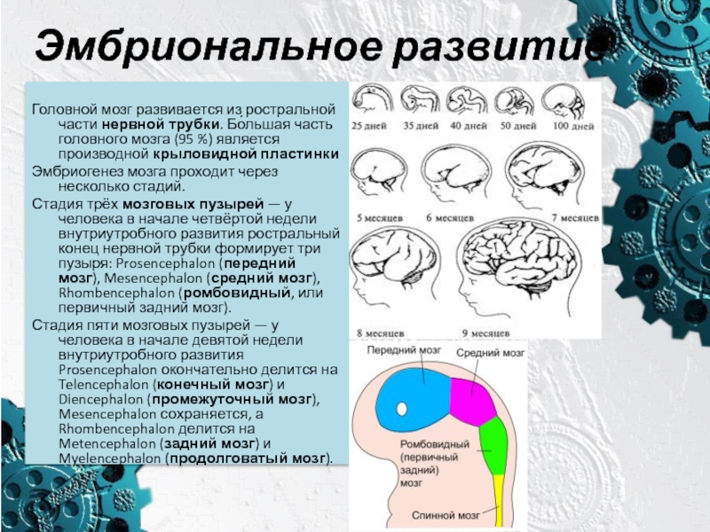 Стадия пяти мозговых пузырей — у человека в начале девятой недели внутриутробного развития Prosencephalon окончательно делится на Telencephalon (конечный мозг) и Diencephalon (промежуточный мозг), Mesencephalon сохраняется, а Rhombencephalon делится на Metencephalon (задний мозг) и Myelencephalon (продолговатый мозг).