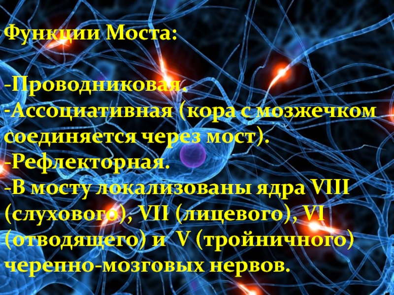 VIII (слухового), VII (лицевого), VI (отводящего) и V (тройничного) черепно-мозговых нервов.