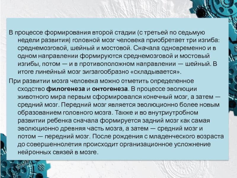 головной мозг человека приобретает три изгиба: среднемозговой, шейный и мостовой. Сначала одновременно и в одном направлении формируются среднемозговой и мостовый изгибы, потом — и в противоположном направлении — шейный. В итоге линейный мозг зигзагообразно «складывается».