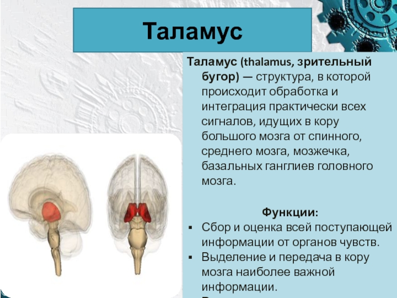 Таламус (thalamus, зрительный бугор) — структура, в которой происходит обработка и