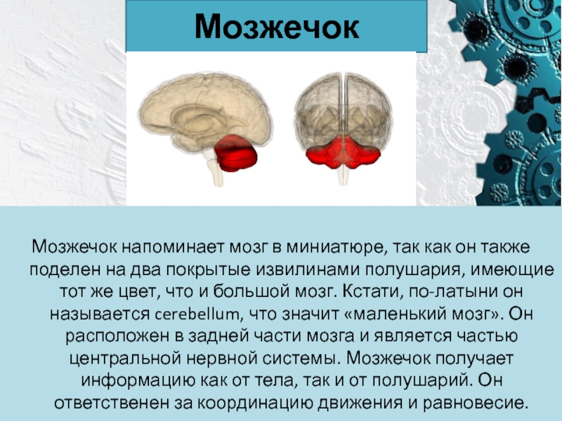два покрытые извилинами полушария, имеющие тот же цвет, что и большой мозг. Кстати, по-латыни он называется cerebellum, что значит «маленький мозг». Он расположен в задней части мозга и является частью центральной нервной системы. Мозжечок получает информацию как от тела, так и от полушарий. Он ответственен за координацию движения и равновесие.