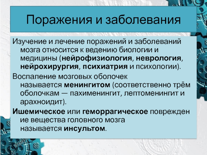 Воспаление мозговых оболочек называется менингитом (соответственно трём оболочкам — пахименингит, лептоменингит и арахноидит).