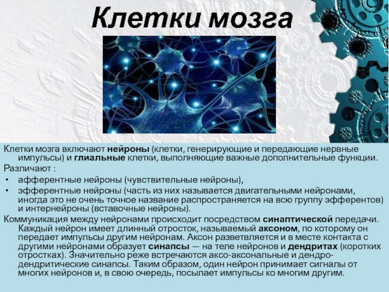 Клетки мозга включают нейроны (клетки, генерирующие и передающие нервные импульсы) и глиальные клетки, выполняющие