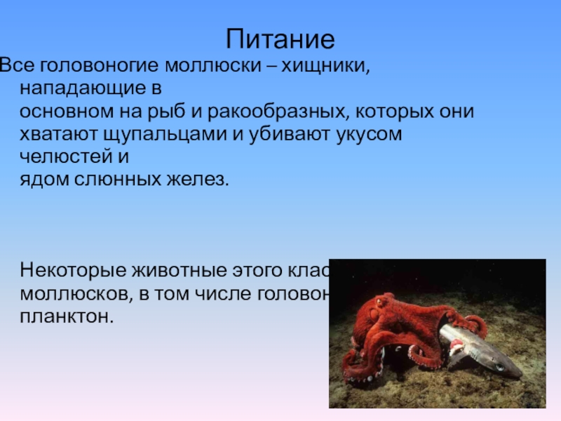 С помощью воронки головоногие плавают. Вода резко выбрасывается из мантийной полости, причем сам моллюск движется толчками задом наперед. Это реактивное движение.