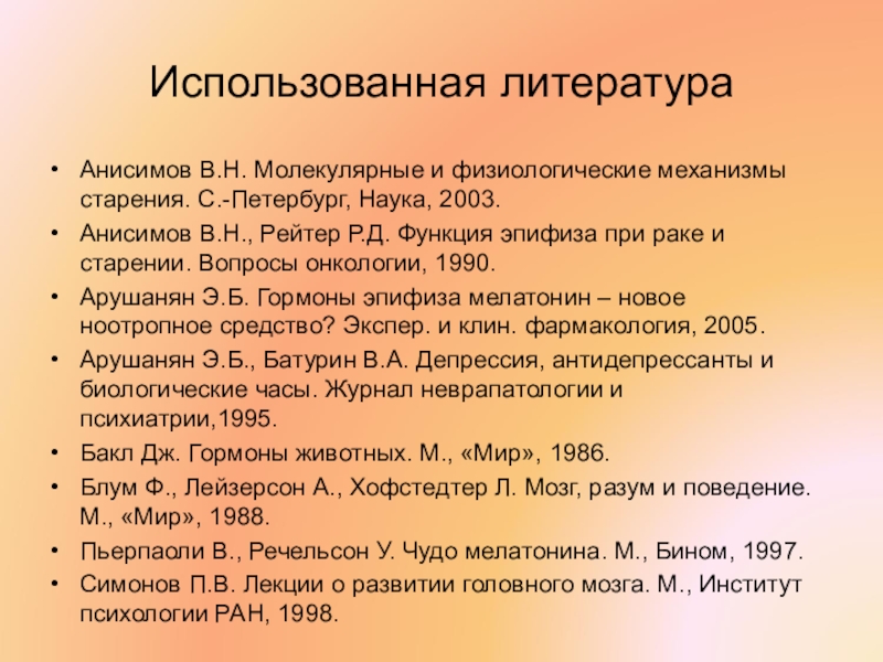 Арушанян Э.Б. Гормоны эпифиза мелатонин – новое ноотропное средство? Экспер. и клин. фармакология, 2005.