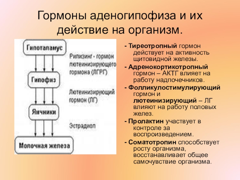 Слайд 10Гормоны аденогипофиза и их действие на организм.