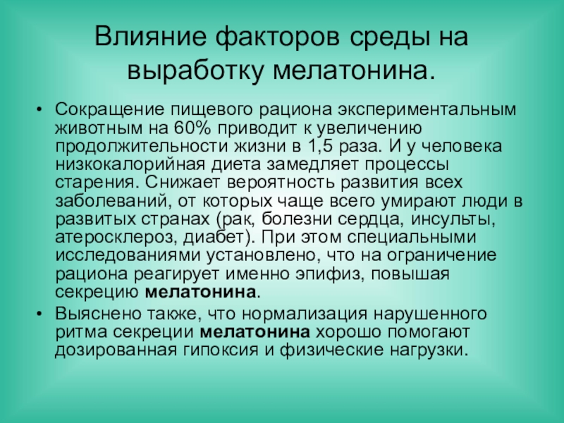 Слайд 17Влияние факторов среды на выработку мелатонина.