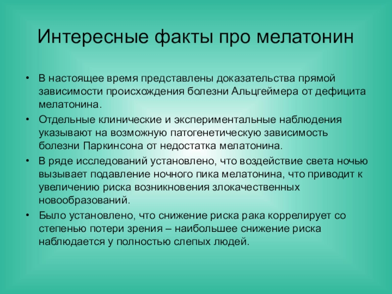Отдельные клинические и экспериментальные наблюдения указывают на возможную патогенетическую зависимость болезни Паркинсона от недостатка мелатонина.