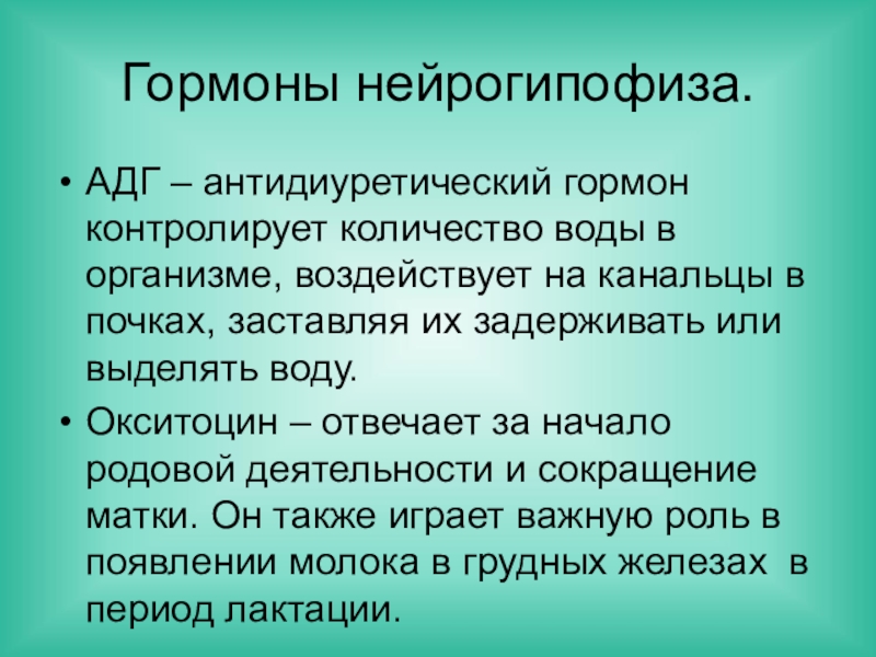 АДГ – антидиуретический гормон контролирует количество воды в организме, воздействует