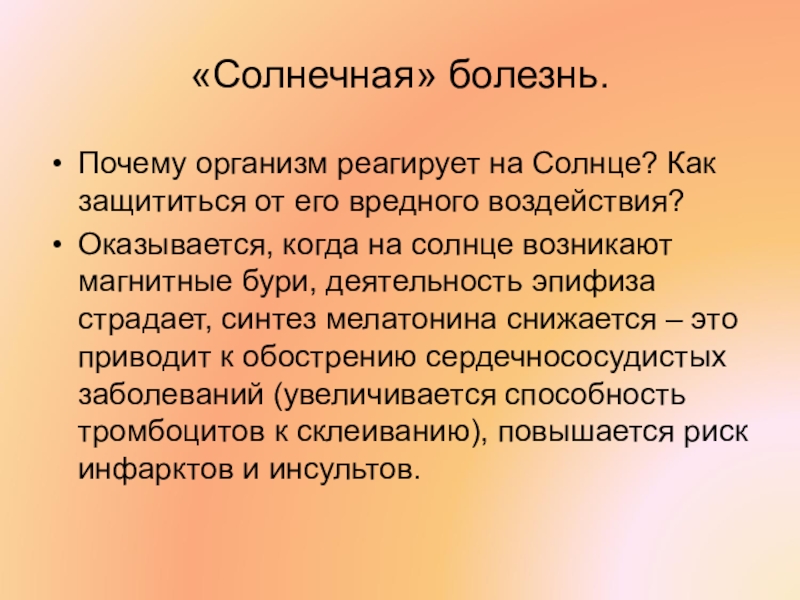 Оказывается, когда на солнце возникают магнитные бури, деятельность эпифиза страдает, синтез мелатонина снижается – это приводит к обострению сердечнососудистых заболеваний (увеличивается способность тромбоцитов к склеиванию), повышается риск инфарктов и инсультов.