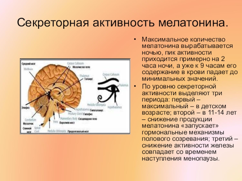 По уровню секреторной активности выделяют три периода: первый – максимальный – в детском возрасте; второй – в 11-14 лет – снижение продукции мелатонина «запускает» гормональные механизмы полового созревания; третий – снижение активности железы совпадает со временем наступления менопаузы.