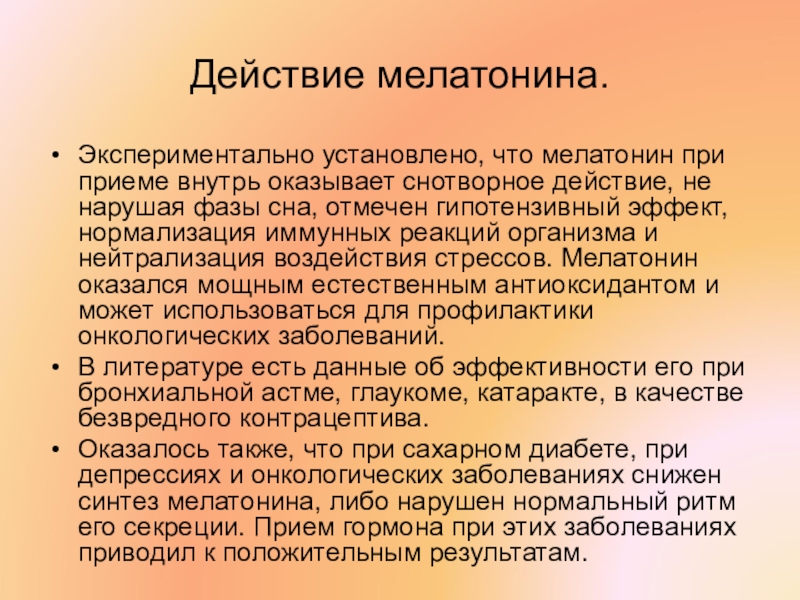 Экспериментально установлено, что мелатонин при приеме внутрь оказывает снотворное действие,