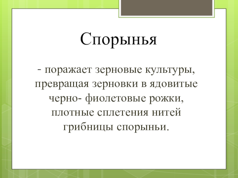 Спорынья- поражает зерновые культуры, превращая зерновки в ядовитые черно- фиолетовые рожки, плотные сплетения нитей грибницы спорыньи.
