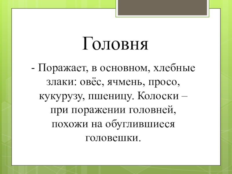 Головня- Поражает, в основном, хлебные злаки: овёс, ячмень, просо, кукурузу, пшеницу. Колоски – при поражении головней, похожи