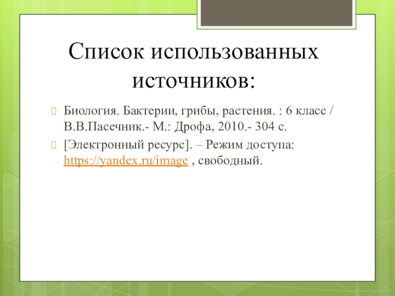 Список использованных источников:Биология. Бактерии, грибы, растения. : 6 класс / В.В.Пасечник.- М.: Дрофа, 2010.- 304 с.[Электронный ресурс].
