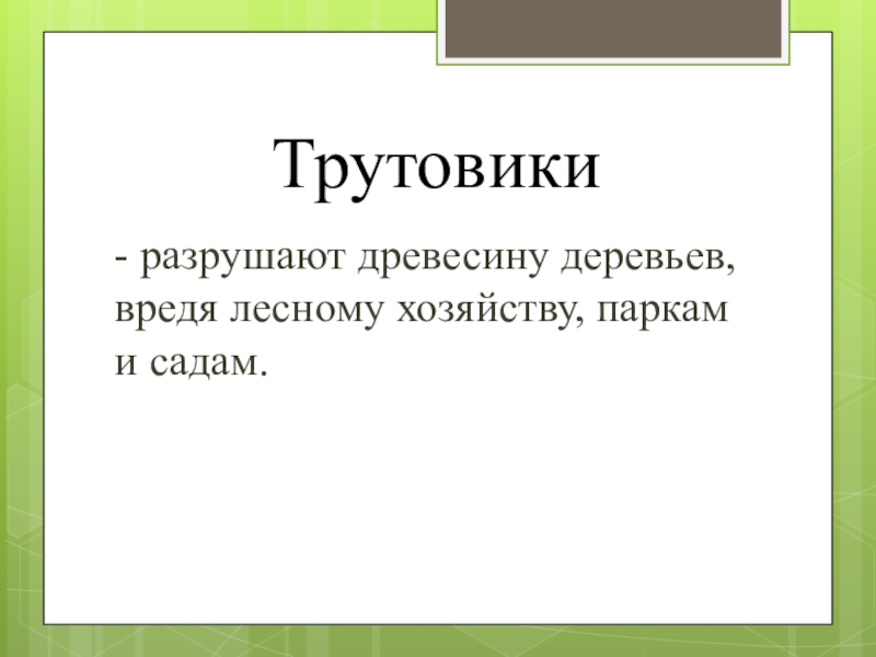 Трутовики- разрушают древесину деревьев, вредя лесному хозяйству, паркам и садам.