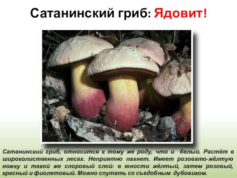 белый. Растёт в широколиственных лесах. Неприятно пахнет. Имеет розовато-жёлтую ножку и такой же споровый слой: в юности жёлтый, затем розовый, красный и фиолетовый. Можно спутать со съедобным дубовиком.