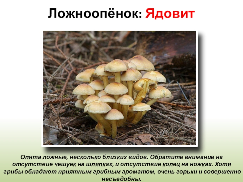 на шляпках, и отсутствие колец на ножках. Хотя грибы обладают приятным грибным ароматом, очень горьки и совершенно несъедобны.