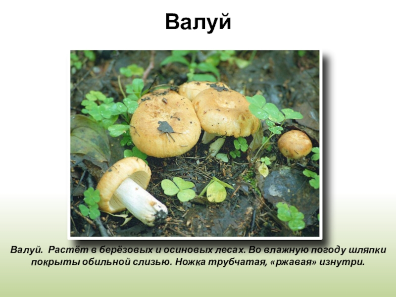 Валуй. Растёт в берёзовых и осиновых лесах. Во влажную погоду шляпки