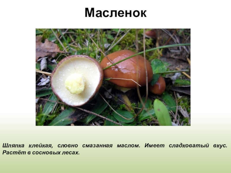 Шляпка клейкая, словно смазанная маслом. Имеет сладковатый вкус. Растёт в сосновых