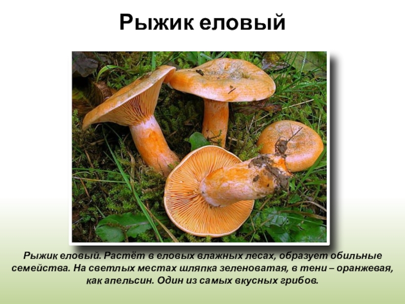Рыжик еловый. Растёт в еловых влажных лесах, образует обильные семейства.