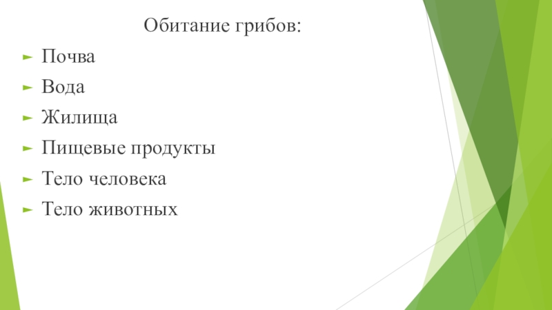 Обитание грибов:ПочваВодаЖилищаПищевые продуктыТело человекаТело животных