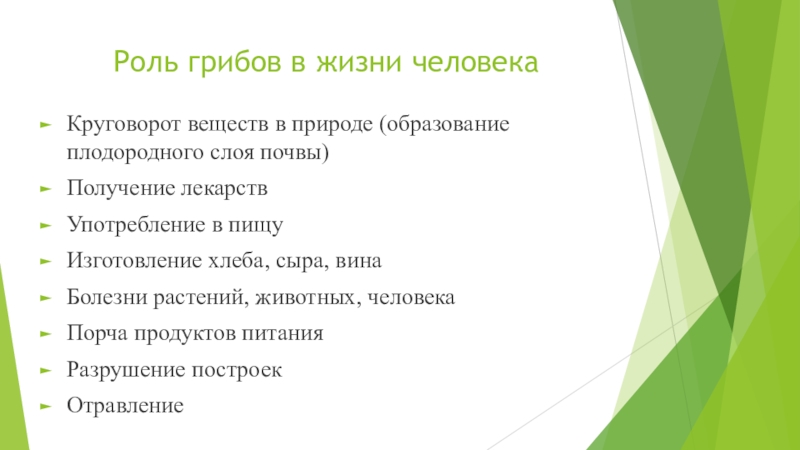 Роль грибов в жизни человекаКруговорот веществ в природе (образование плодородного слоя почвы)Получение лекарствУпотребление в пищуИзготовление хлеба, сыра,
