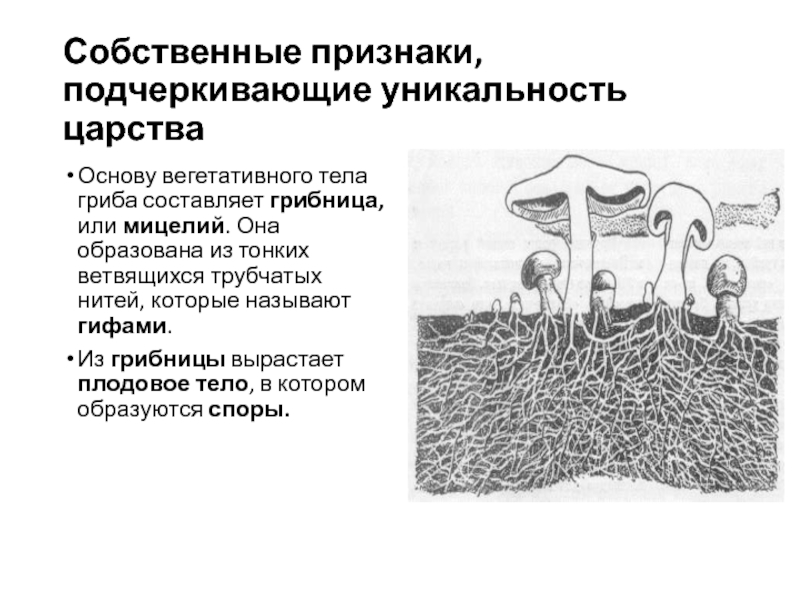 Собственные признаки, подчеркивающие уникальность царстваОснову вегетативного тела гриба составляет грибница, или мицелий. Она образована из тонких ветвящихся