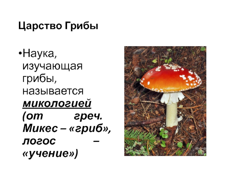 Царство ГрибыНаука, изучающая грибы, называется микологией (от греч. Микес – «гриб», логос – «учение»)