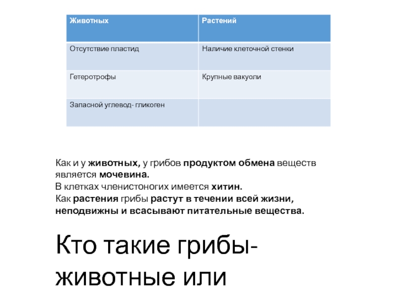 Как и у животных, у грибов продуктом обмена веществ является мочевина.В клетках членистоногих имеется хитин.Как растения грибы