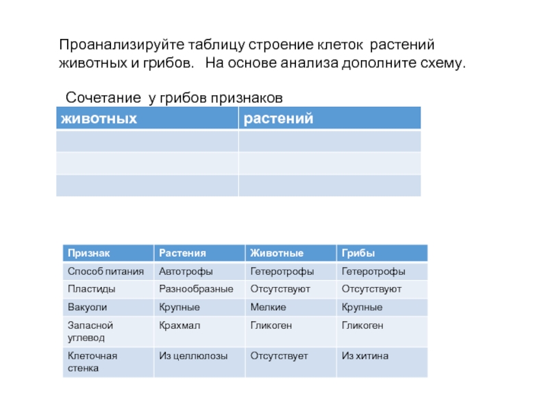 Слайд 8Проанализируйте таблицу строение клеток растений животных и грибов. На основе