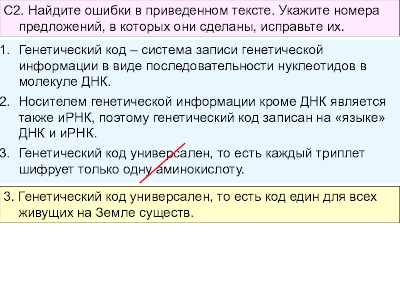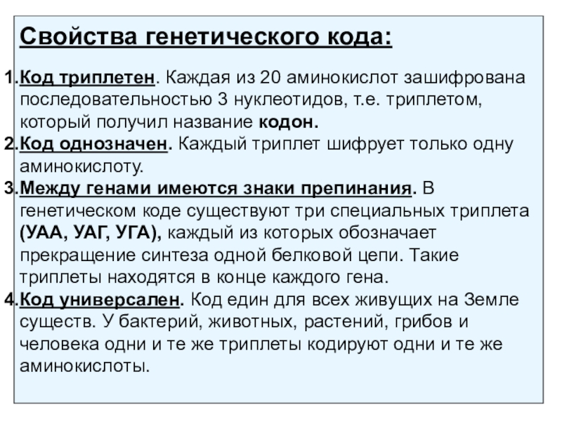 3. Генетический код универсален, то есть код един для всех живущих на Земле существ.