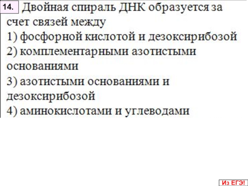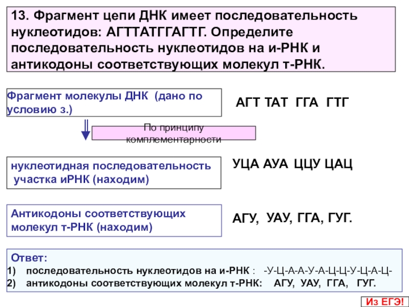 13. Фрагмент цепи ДНК имеет последовательность нуклеотидов: АГТТАТГГАГТГ. Определите последовательность нуклеотидов на и-РНК и антикодоны соответствующих молекул т-РНК.