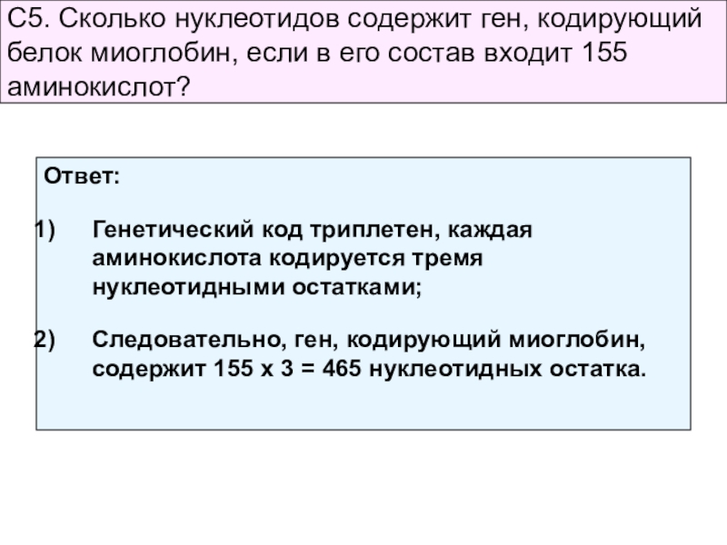 Следовательно, ген, кодирующий миоглобин, содержит 155 х 3 = 465 нуклеотидных остатка.
