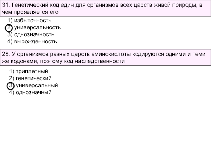 28. У организмов разных царств аминокислоты кодируются одними и теми же кодонами, поэтому код наследственности