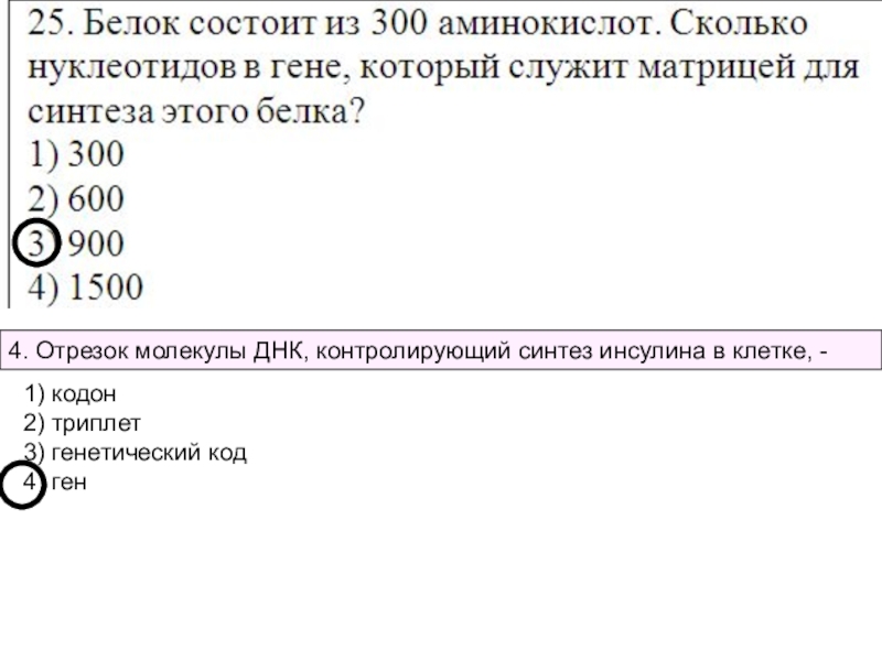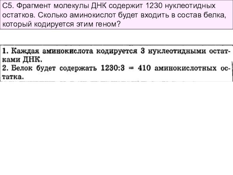 С5. Определите, во сколько раз молекула белка инсулина легче, чем кодирующий ее структурный ген. Инсулин состоит из 51 аминокислотного остатка. Средняя молекулярная масса одного аминокислотного остатка – 110 а.е.м. Средняя молекулярная масса одного нуклеотида – 345 а.е.м.