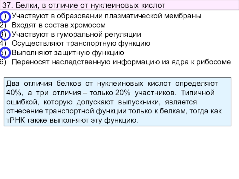 Два отличия белков от нуклеиновых кислот определяют 40%, а три отличия – только 20% участников. Типичной ошибкой, которую допускают выпускники, является отнесение транспортной функции только к белкам, тогда как тРНК также выполняют эту функцию.