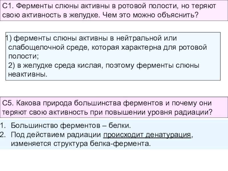 С1. Ферменты слюны активны в ротовой полости, но теряют свою активность в желудке. Чем это можно объяснить?