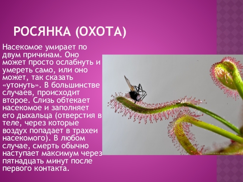 умереть само, или оно может, так сказать «утонуть». В большинстве случаев, происходит второе. Слизь обтекает насекомое и заполняет его дыхальца (отверстия в теле, через которые воздух попадает в трахеи насекомого). В любом случае, смерть обычно наступает максимум через пятнадцать минут после первого контакта.